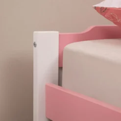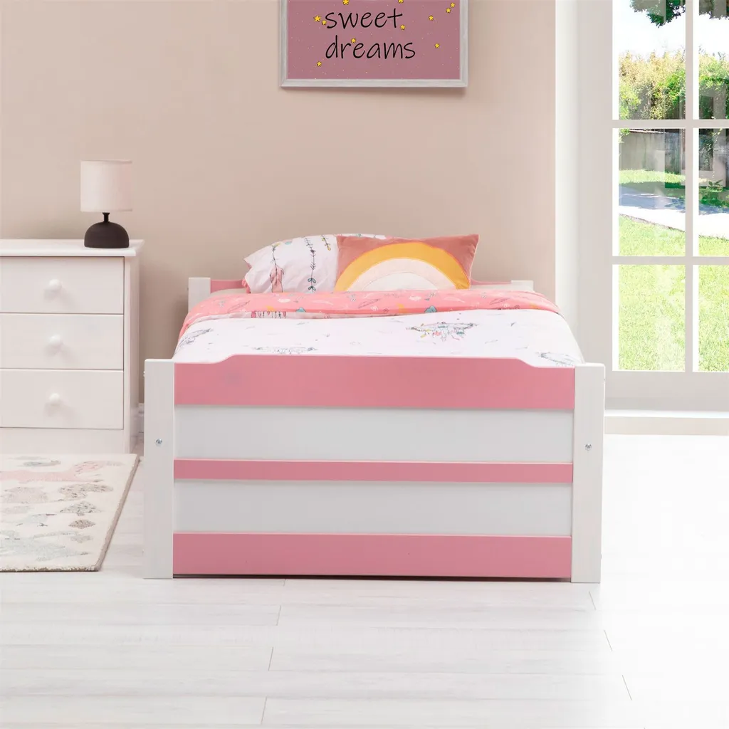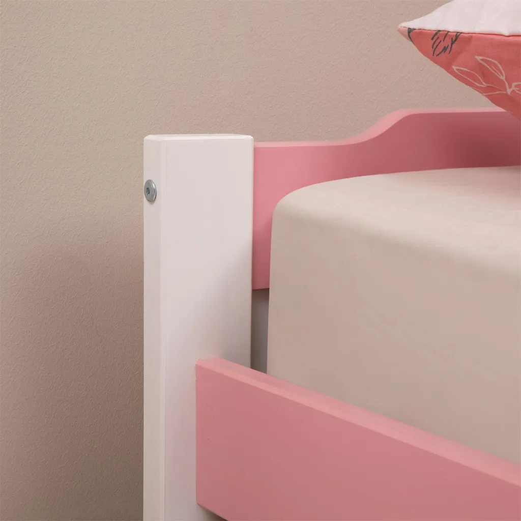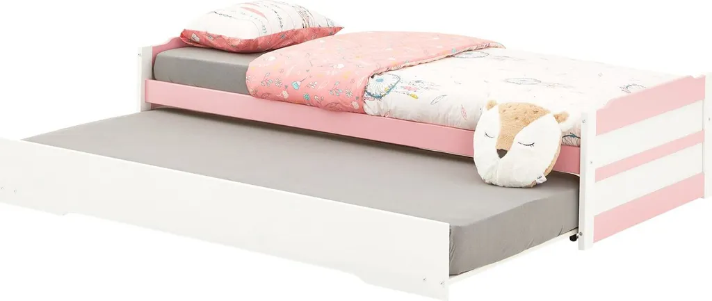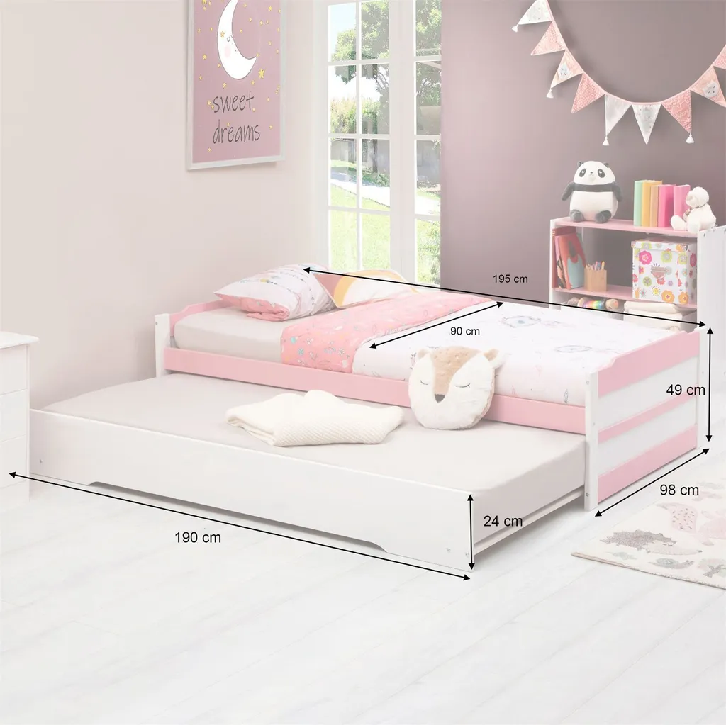 Ausziehbett LORENA In 90 X 190 Cm, Schönes Kinderbett Aus Kiefer Massiv In Weiß/rosa, Praktisches Jugendbett Mit Auszugskasten