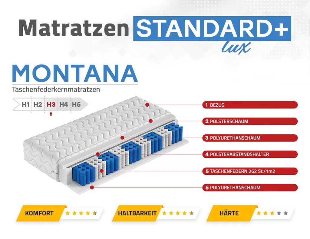 Schreibe die erste Rezension für „Doppelseitig Matratze 200×200 Cm Mit 7-Zonen Profilierter Schaumstoffplatte – Taschenfederkernmatratze Mit Hypoallergenem Bezug – Mittelhart/Hart – Höhe 18 Cm – MONTANA“ Antwort abbrechen