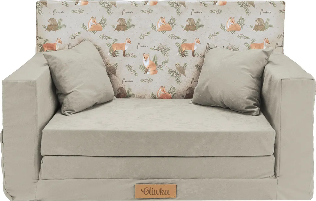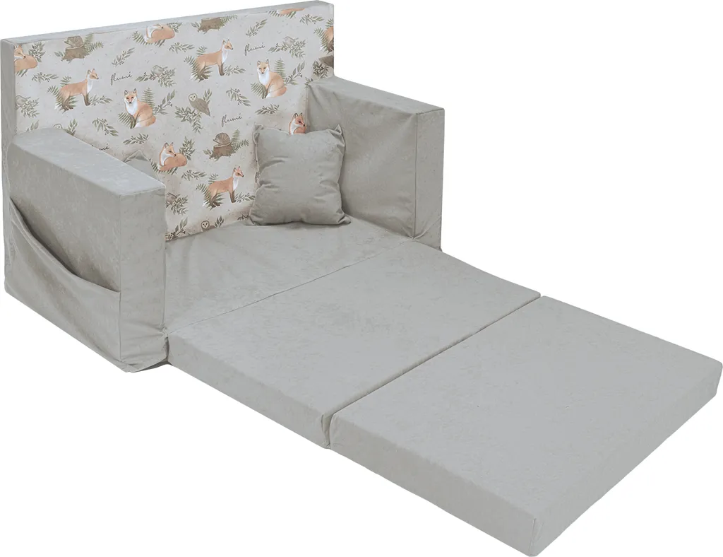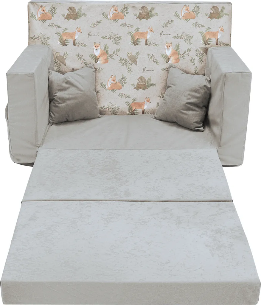 Flumi Kindercouch Kindersofa Mit Schlaffunktion Für Kinderzimmer -Schlafsessel Mit Bettfunktion – Kindermöbel Hellgrau + Füchse