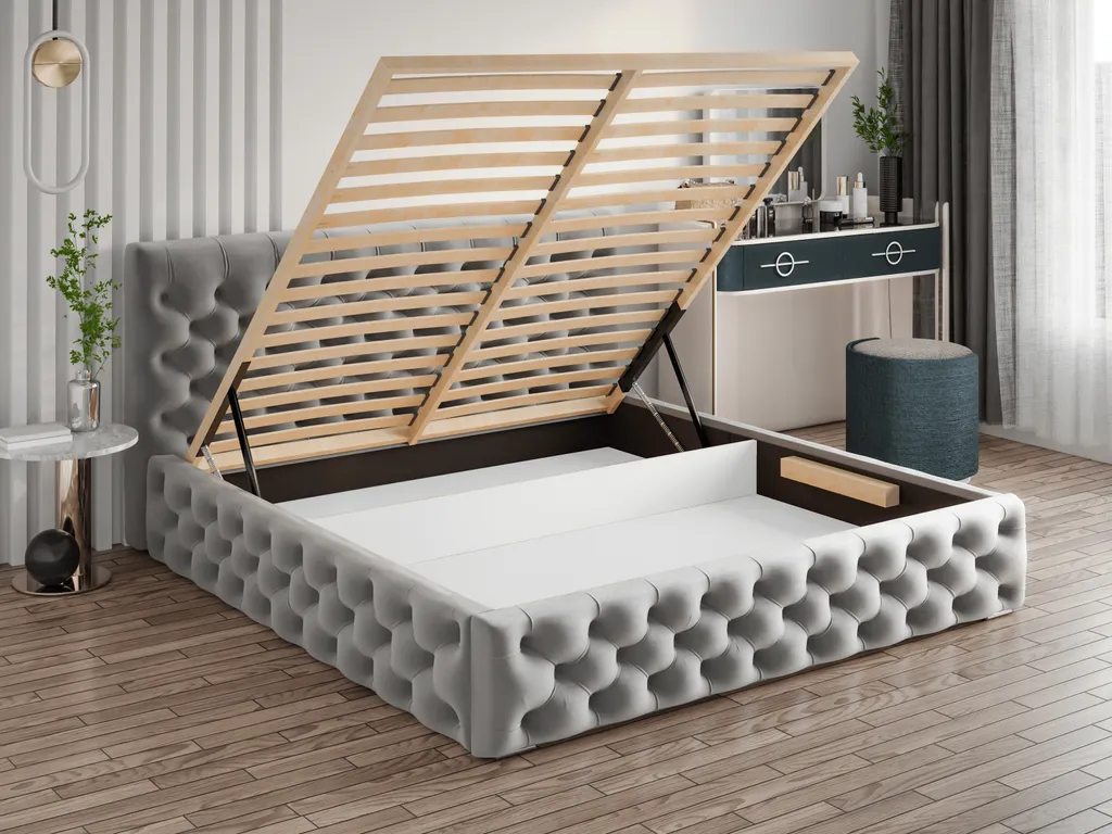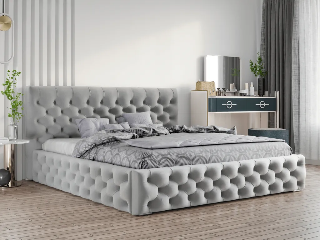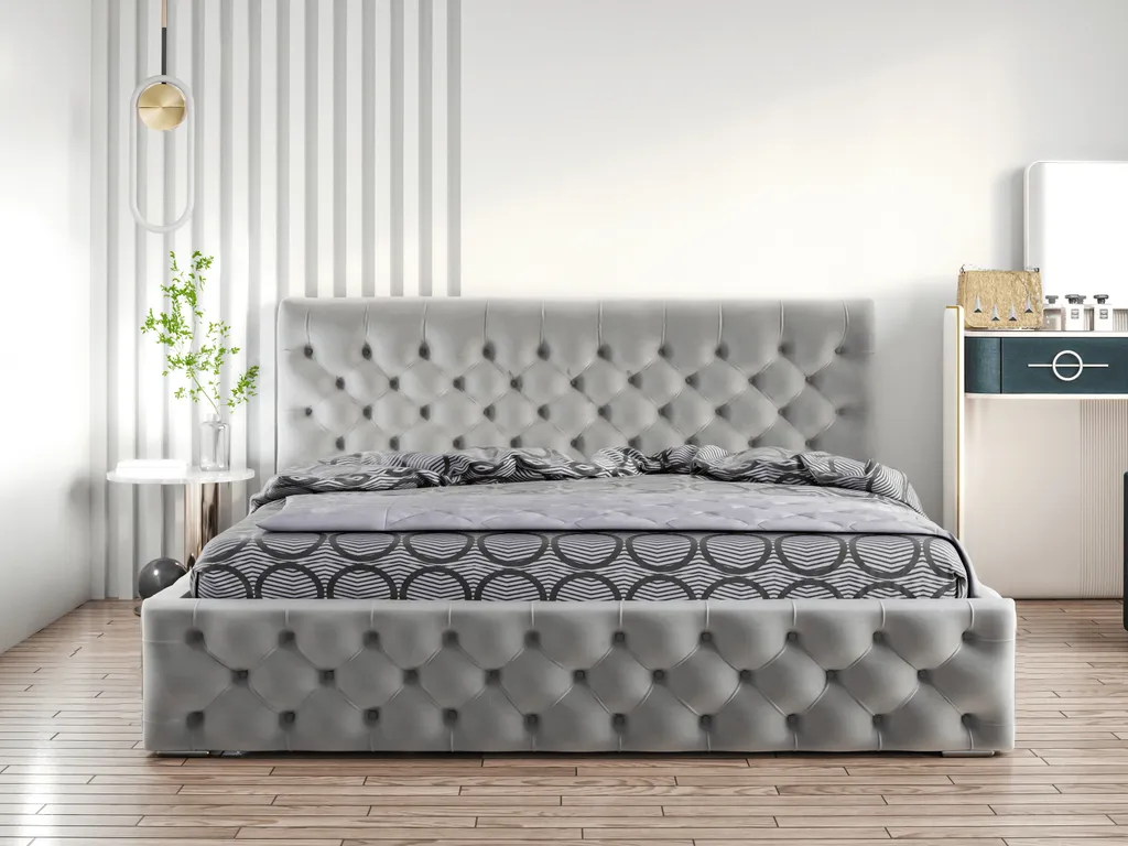 GRAINGOLD Glamour Chesterfield Bett 200×200 Cm Velutto – Samtbett Mit Lattenrost Und Bettkasten – Hellgrau (Magic Velvet 2218)
