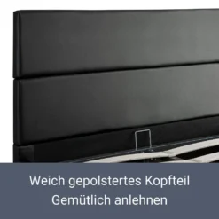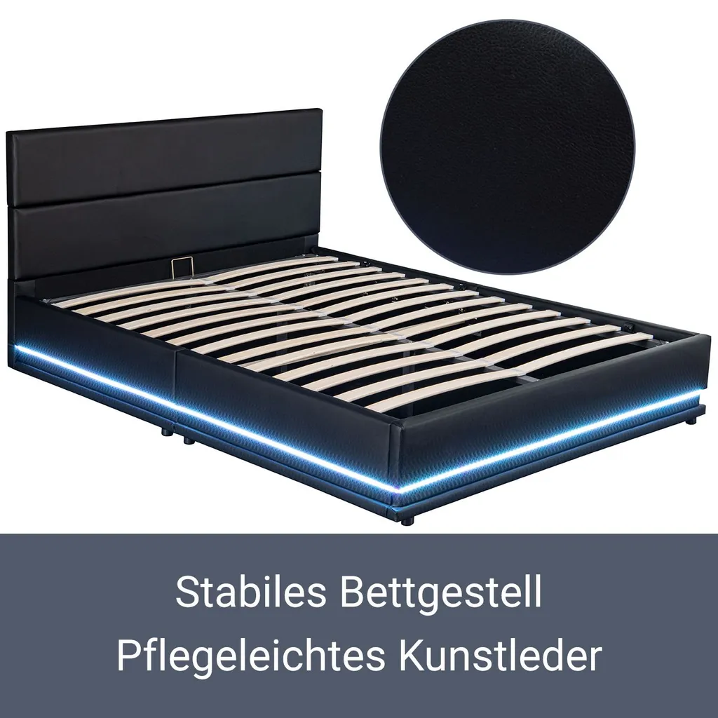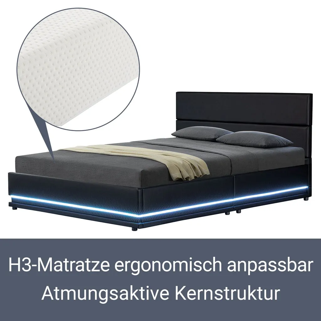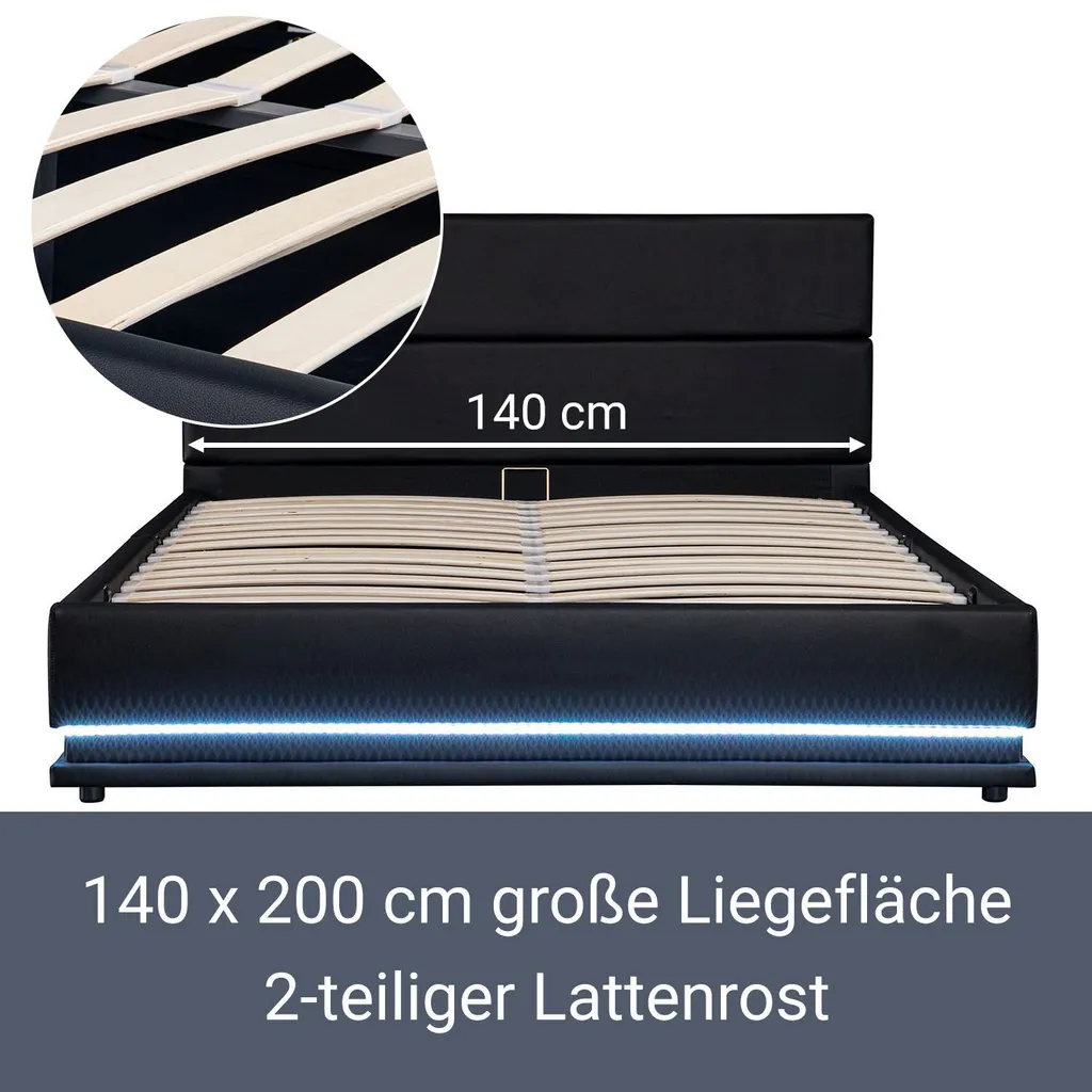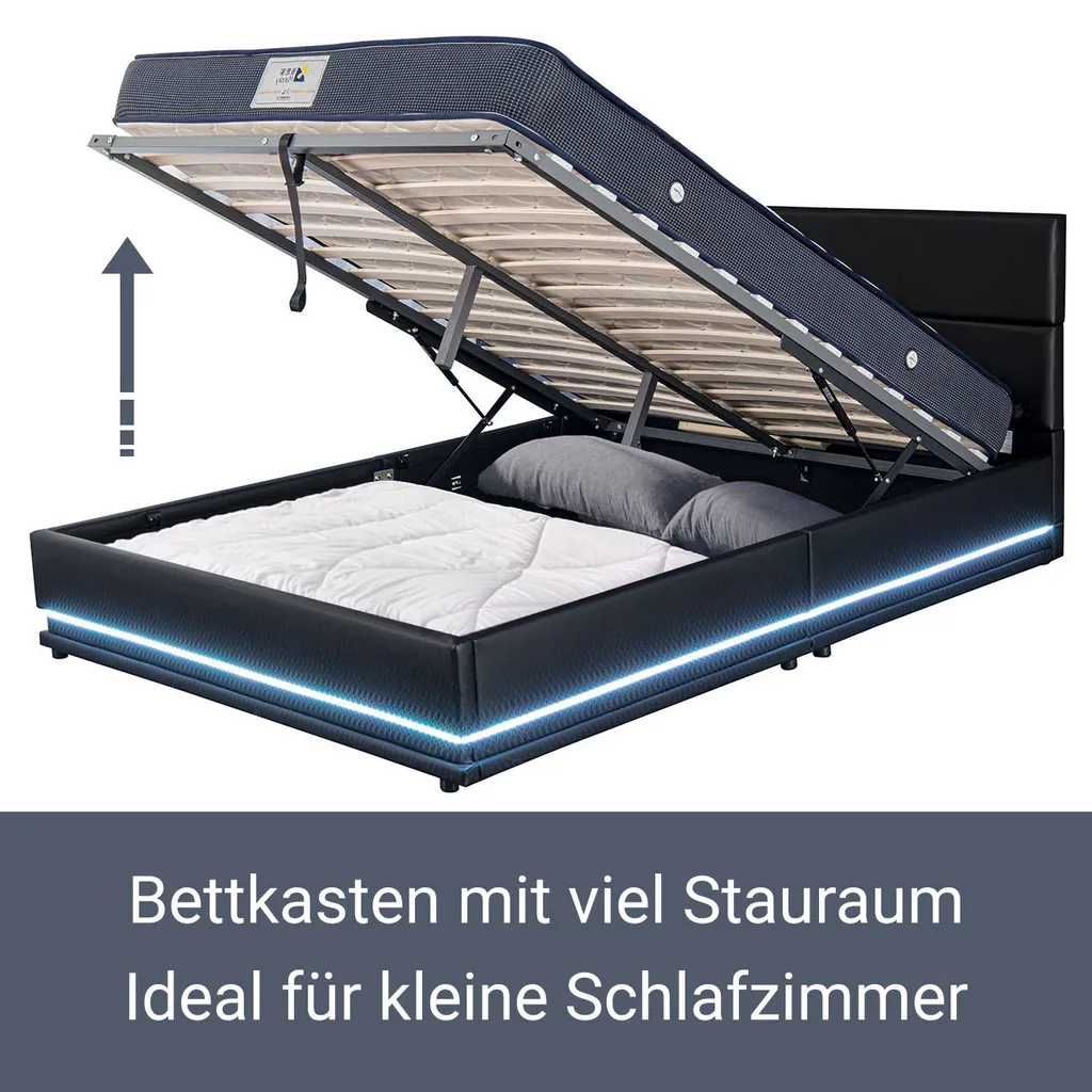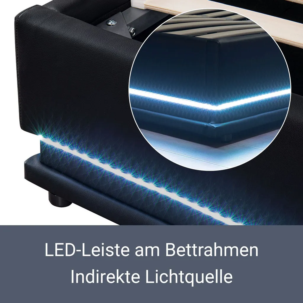 Juskys Polsterbett Toulouse 140 X 200 Cm Mit Bettkasten, LED Beleuchtung, Lattenrost & Matratze, Kunstleder & Holz Bett Bettgestell Jugendbett Schwarz