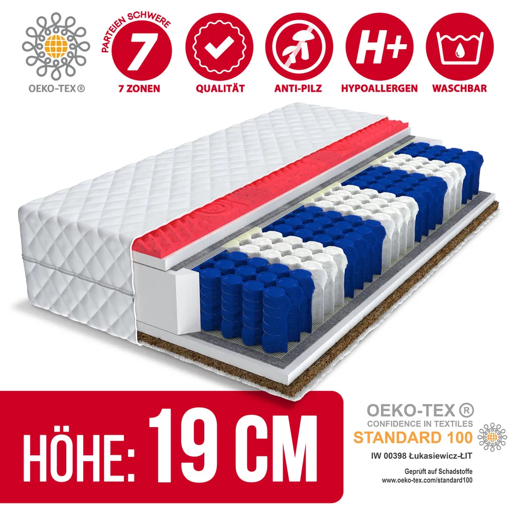 Matratze 180×200 Cm ANGELO 7 Zonen H3 H4 Taschenfederkern Kokos Gelschaum Angelpearl Höhe Ca. 19 Cm Waschbaren Bezug Matratzenbezug Premium Jersey
