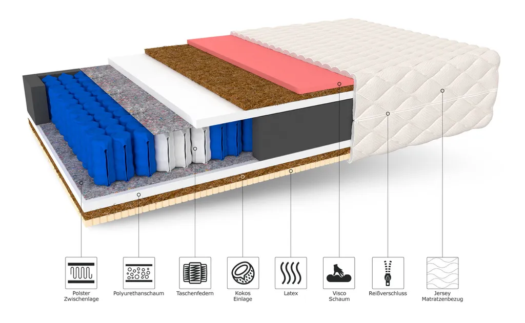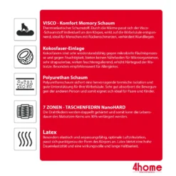 Matratze 180×200 Cm CLAUS 7 Zonen H4 Taschenfederkern Visco Memory Schaum Latex Kokos Höhe Ca. 23 Cm Mit Waschbarem Bezug Premium Jersey
