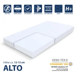| Zusätzliche Varianten | Matratze 80×200 cm ALTO Kaltschaum Höhe ca. 12 cm H3 Kaltschaummatratze Premium Bezug, Matratze 90×200 cm ALTO Kaltschaum Höhe ca. 12 cm H3 Kaltschaummatratze Premium Bezug |