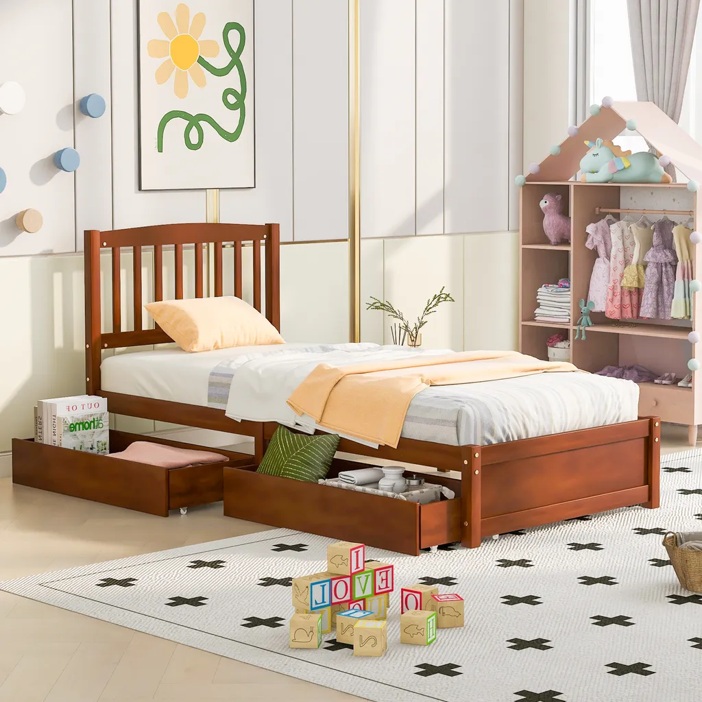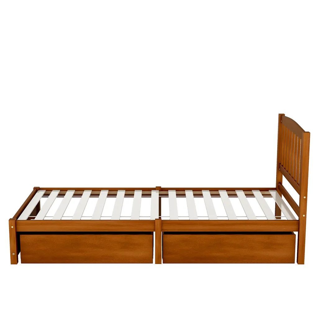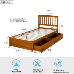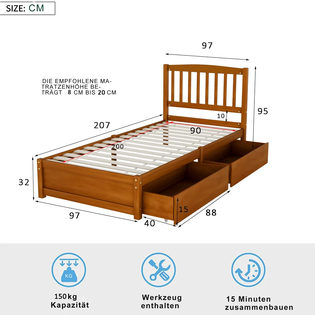 Merax Jugendbetten 90x200cm Einzelbett Massivholzbett Inkl. 2 Schubladen, Kopfteil Und Lattenrost, Gästebett Aus Kiefer, Farbe: Walnuss