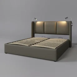 Merax Polsterbett 140x200cm Mit Bettkasten Ohne Bodenplatte, Kunstleder Hydraulisches Boxspringbett Mit Leselicht Und Integrierte Ladefunktion, Funktionsbett Doppelbett Stauraumbett, Grau