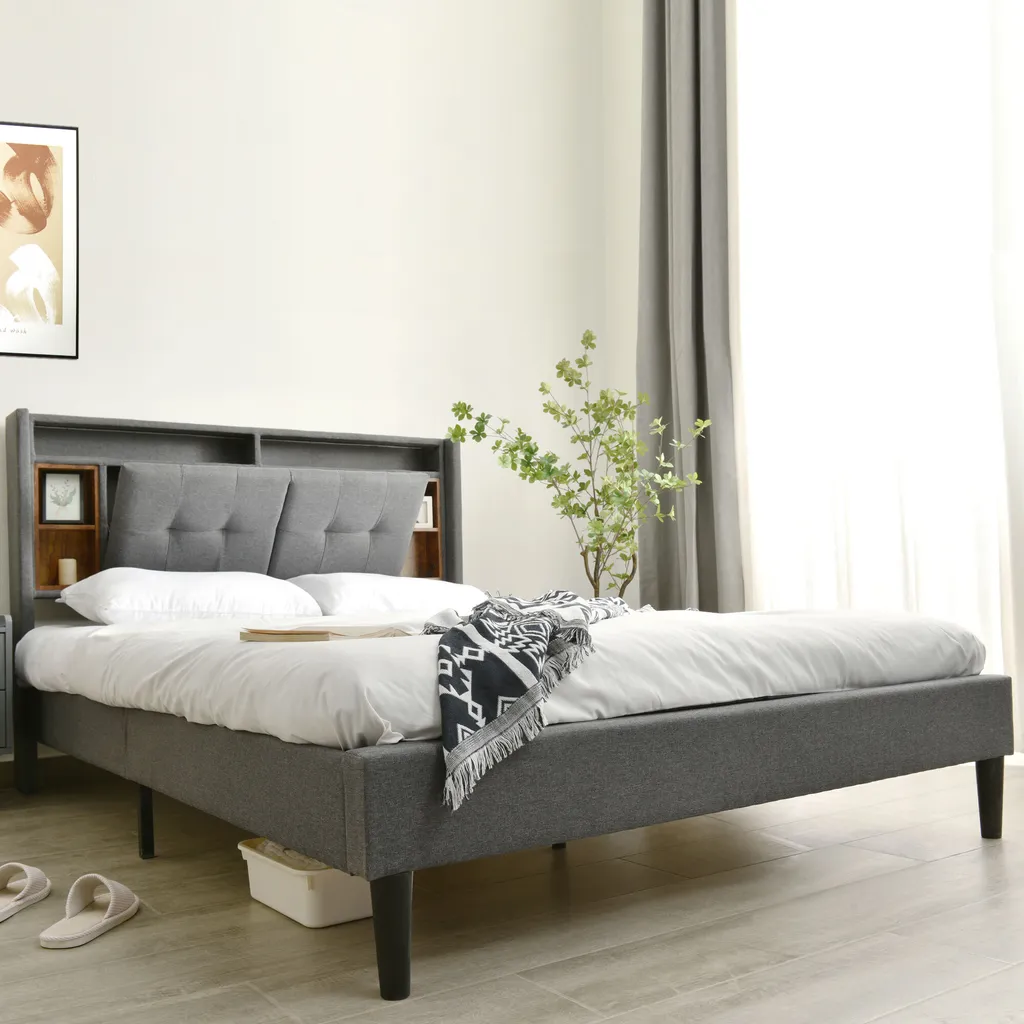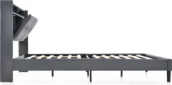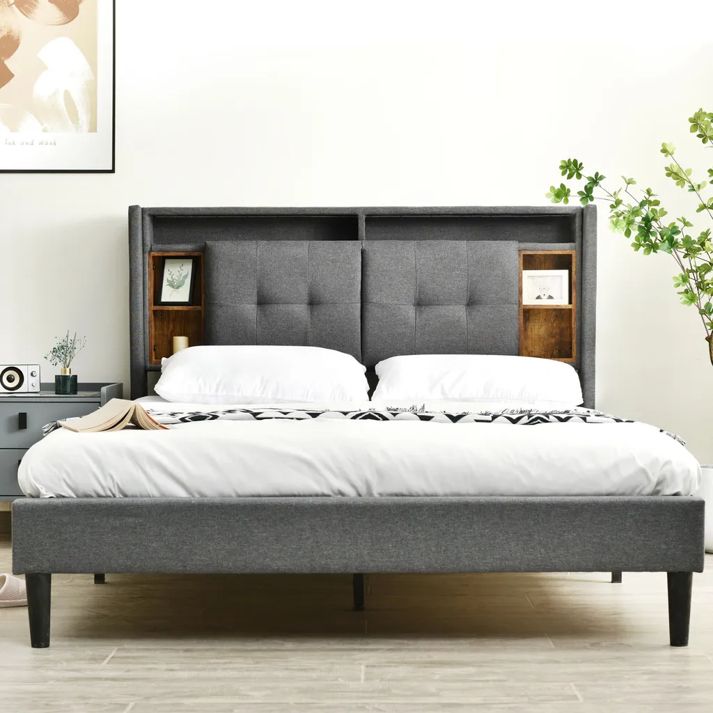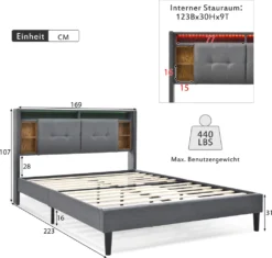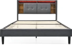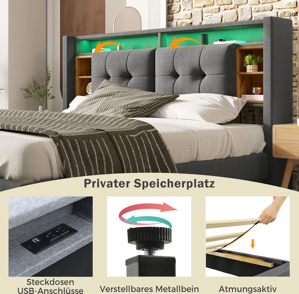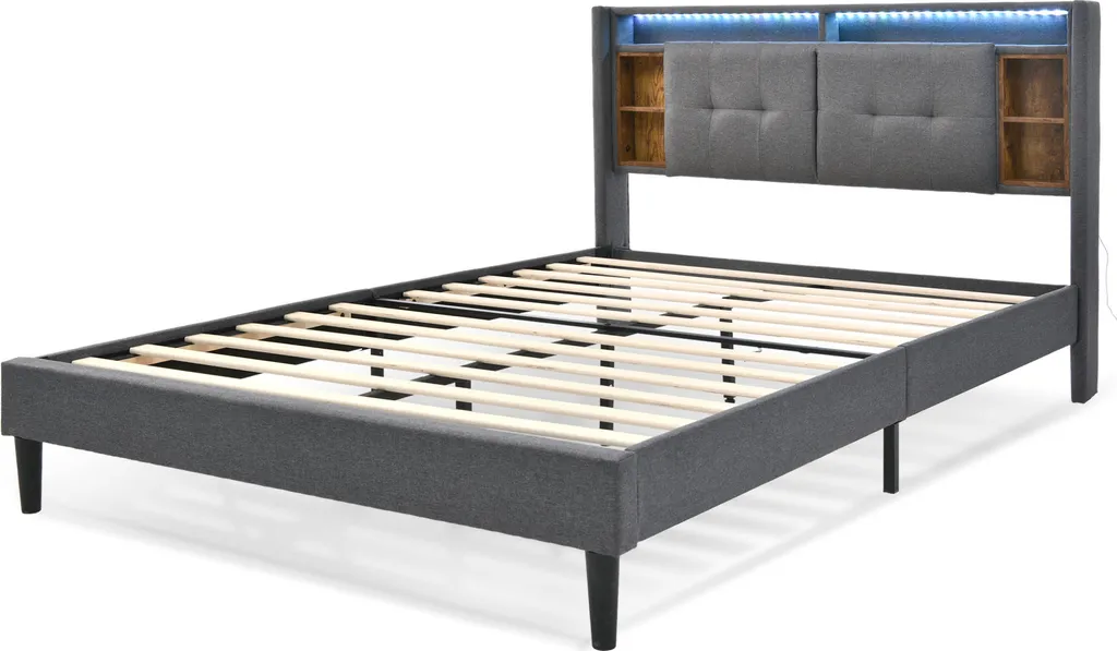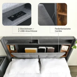 Merax Polsterbett 160×200 Cm Doppelbett Mit Lattenrost Und LED-Beleuchtung, Stauraumfächer Und Steckdosen, Stauraumbett Funktionsbett Aus Leinen, Grau