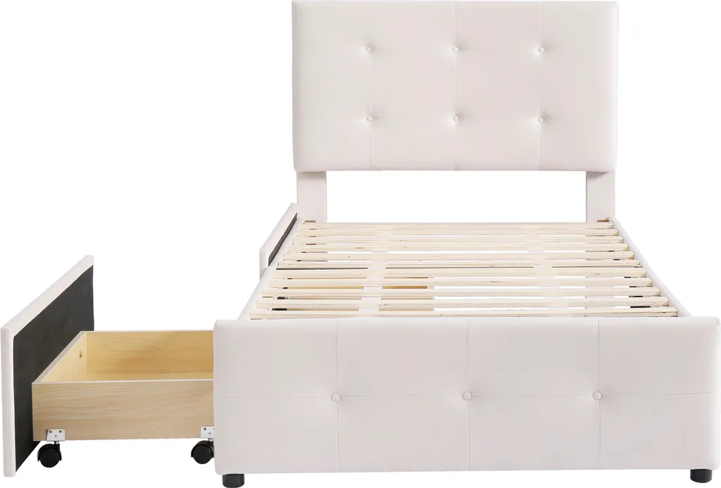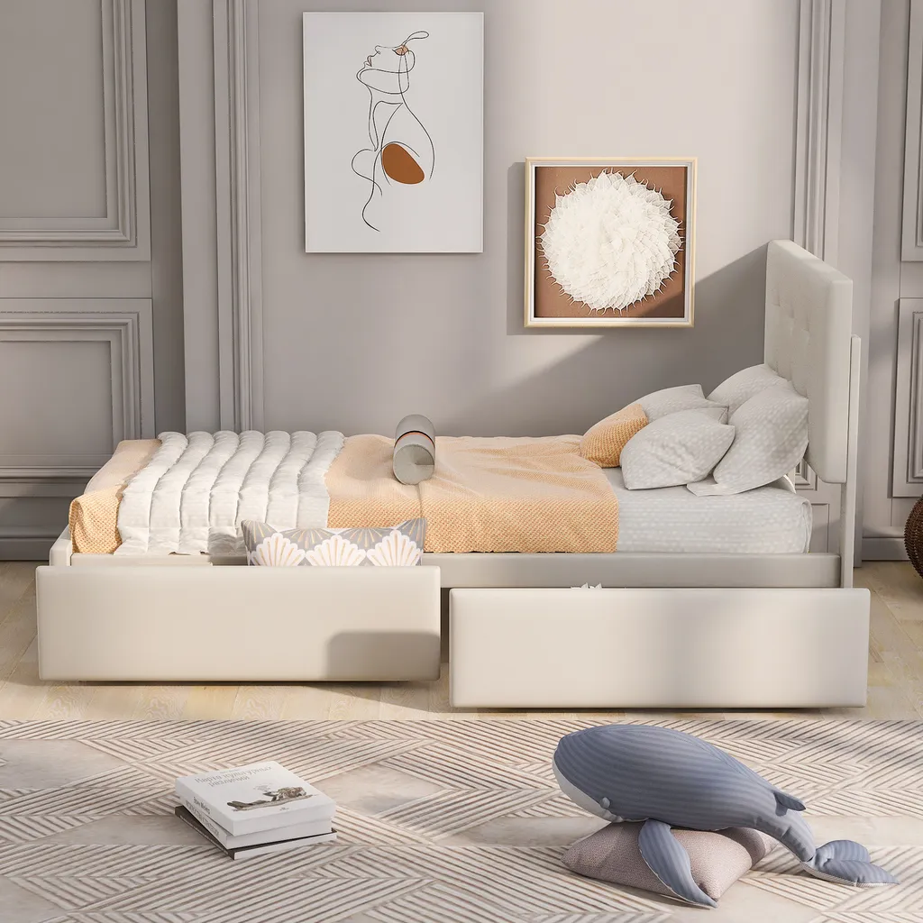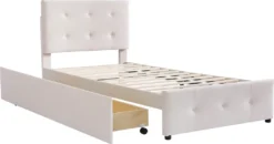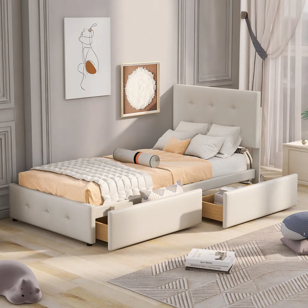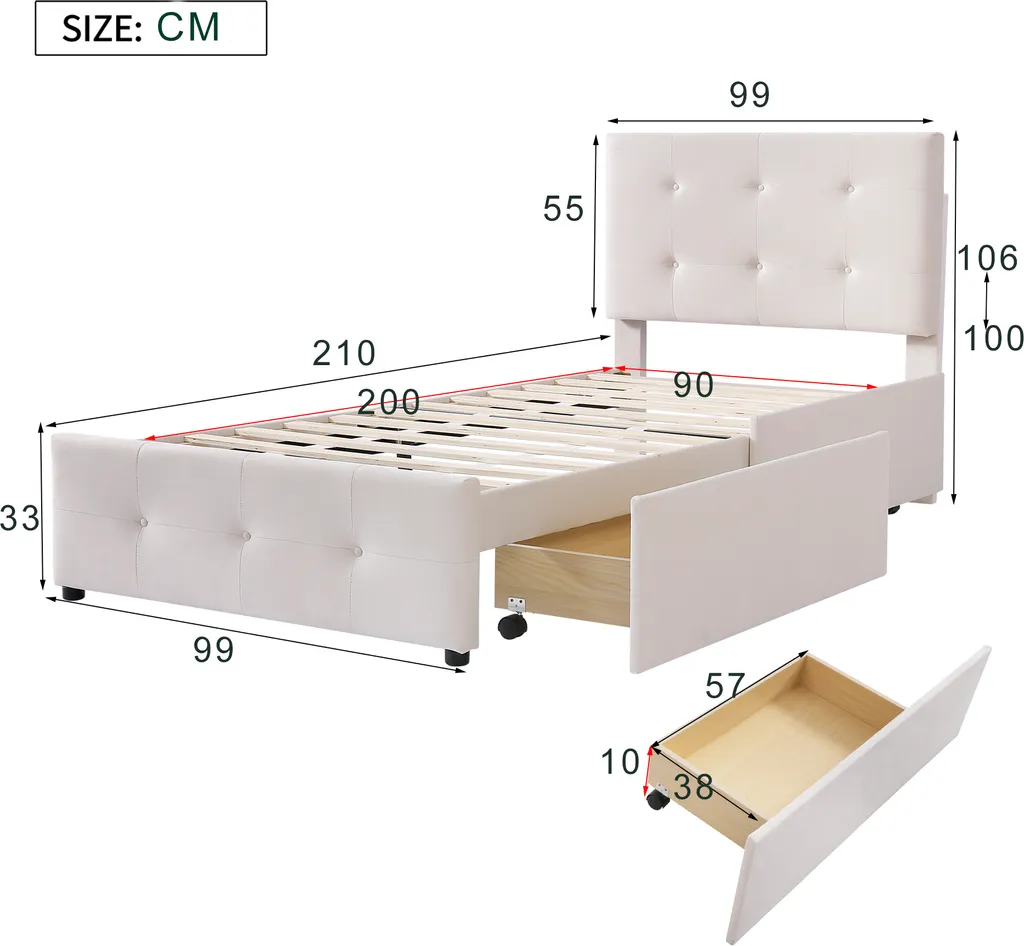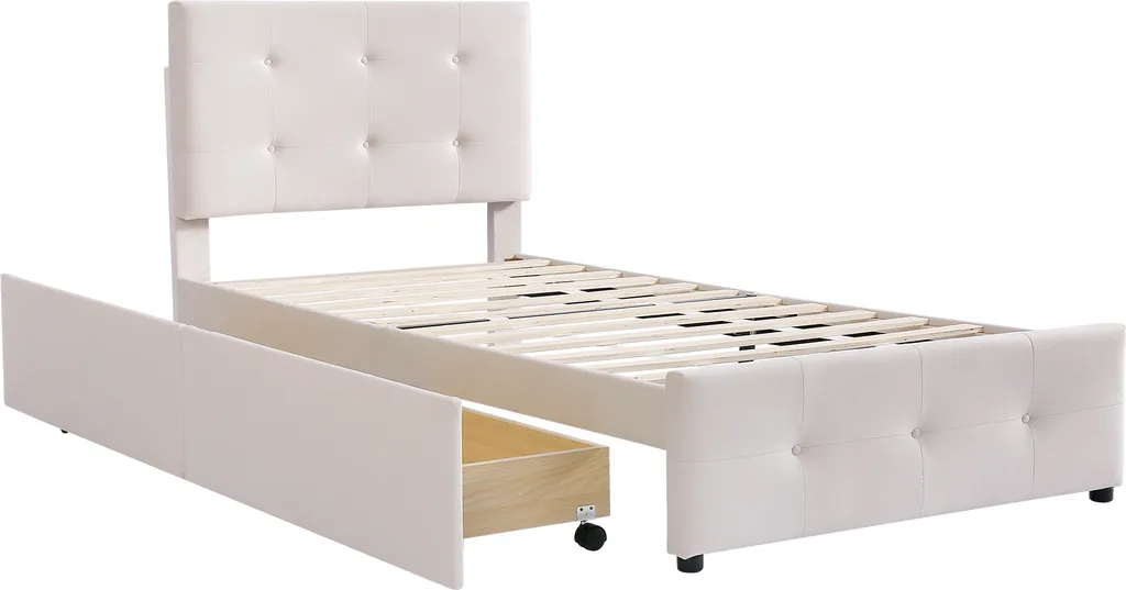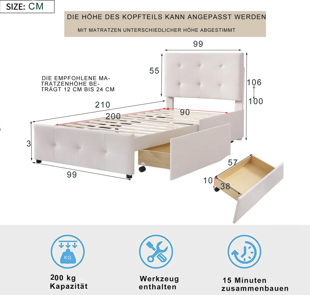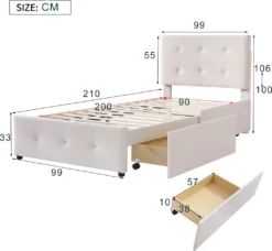 Merax Polsterbett 90×200 Cm Jugendbett Samt Gästebett Einzelbett Mit Lattenrost, Höhenverstellbar Kopfteil Und 2 Schubladen, Beige