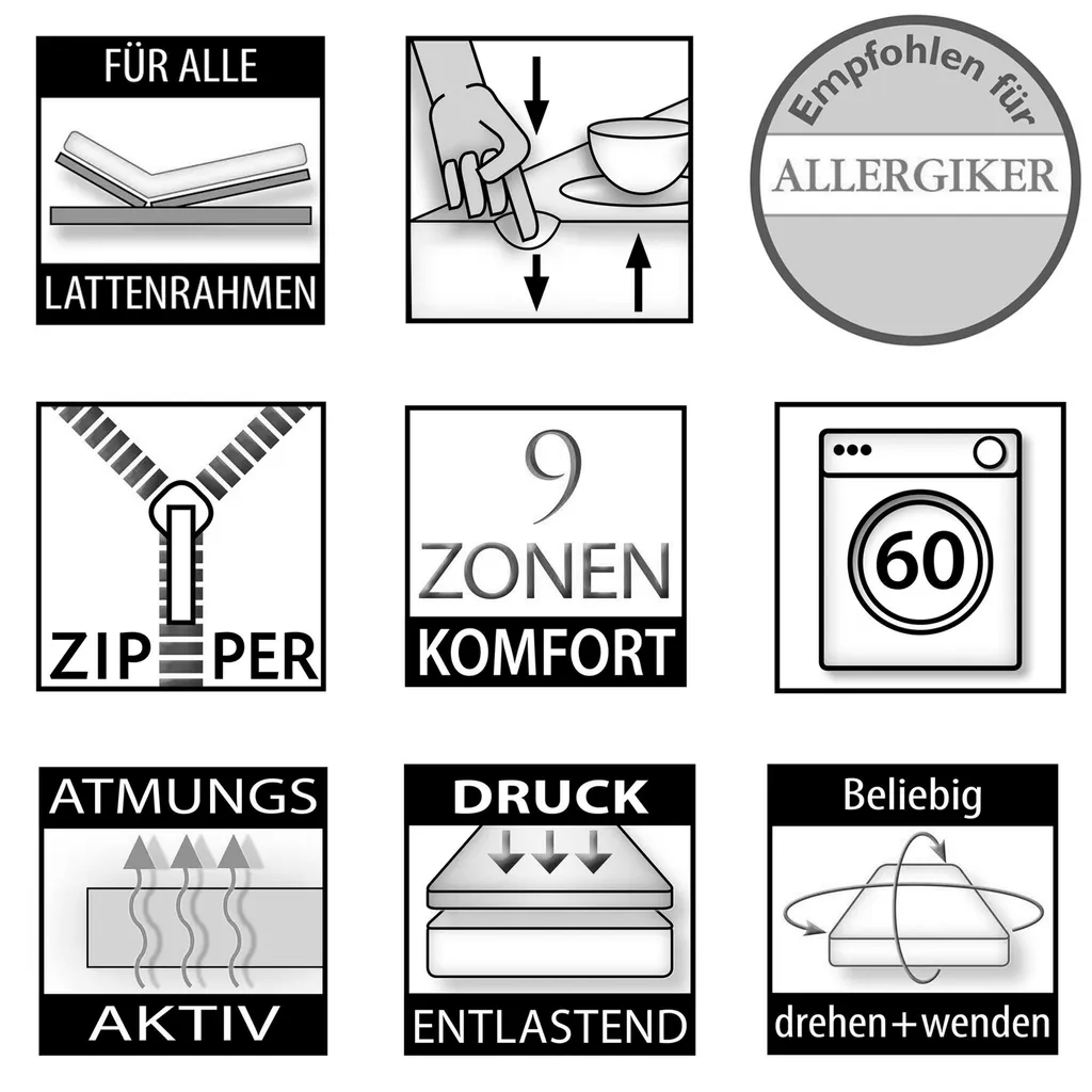 | Bettgröße | 60 x 120 cm, 90 x 200 cm, 140 x 200 cm, 160 x 200 cm, 180 x 200 cm |