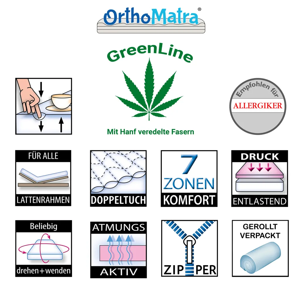 OrthoMatra KSP-500 GreenLine – 7-Zonen- Kaltschaummatratze Mit Hanf-Veredelung : 120×200 : H2