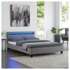 Polsterbett JORDIE Doppelbett Bettgestell In Grau Mit LED Beleuchtung, 140 X 200 Cm, Inklusive Lattenrost