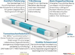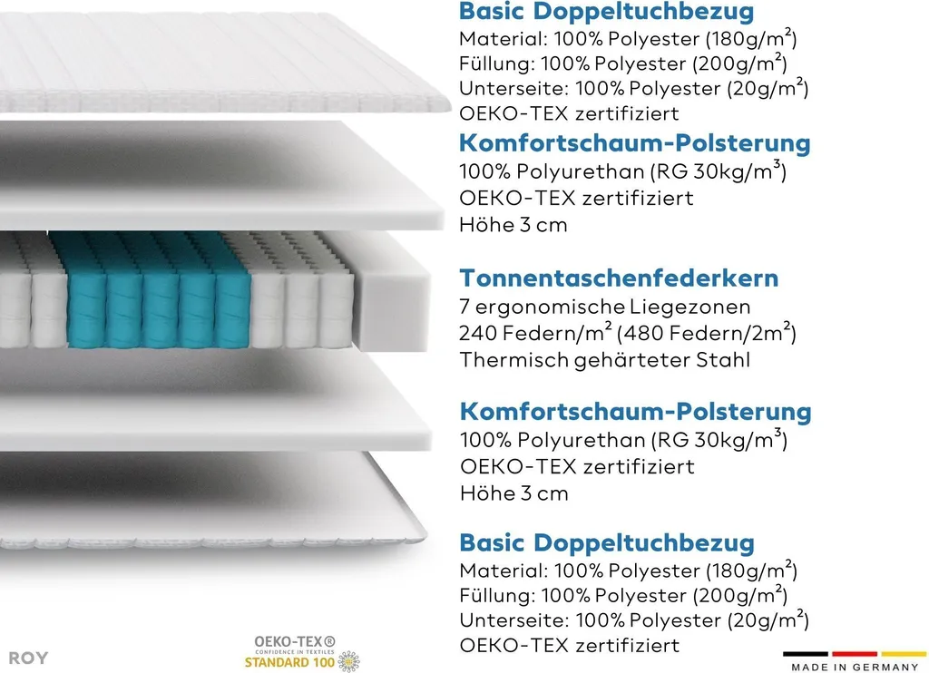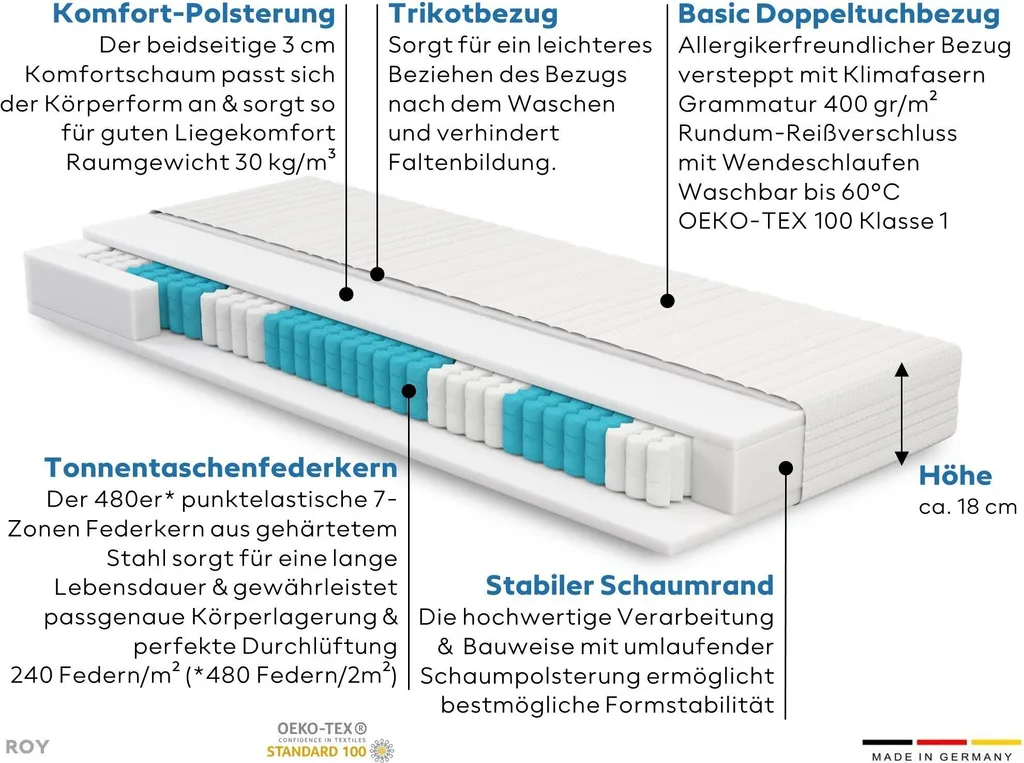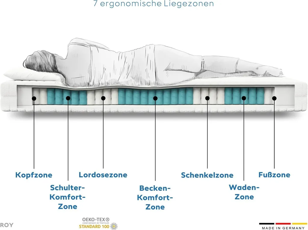 Taschenfederkernmatratze 140×220 – ROY – Härtegrad H2 Bis 80kg – Allergiker – Schwitzen – 7-Zonen – Mittelfest – Matratze 140×220