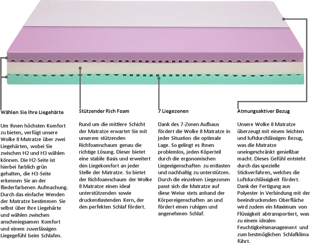 Wolke 8® 7 Zonen Matratze 180×200 Mit 2in1 Härtegrade H2 & H3 Aus 24 Cm Hohem Hybridschaum Kaltschaum